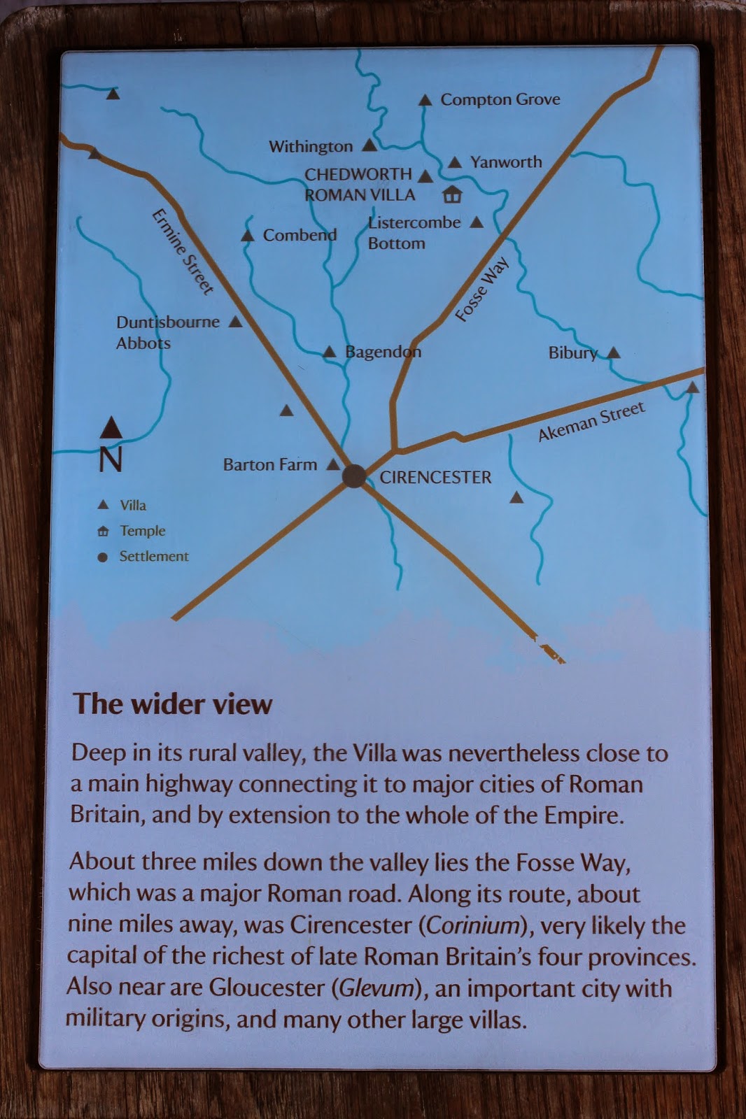 A site information board shows the location of other villas in the area at the time, and shows how close they were to the Fosse Way - the military road built by the Romans to link Exeter with Lincoln which ran through Cirencester, the 2nd largest Roman town after London. Chedworth villa, the best surviving roman villa in the area was built in a very sheltered valley, it had a good water supply, being close to springs spouting water from the nearby hill and it faced south. Just little way away, the River Coln flowed towards the river Thames.