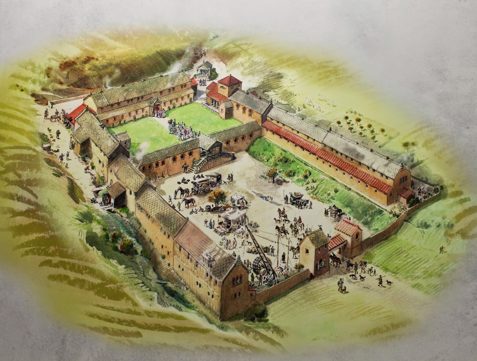 An artists impression of how Chedworth Roman Villa looked c. AD 350 |