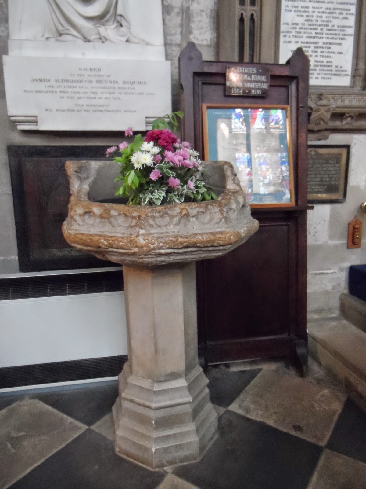 A walk to Holy Trinity Church passing the Royal Shakespeare theatre is highly recommended. In the church, so long as there's no important event taking place, you'll be able to visit the chancel to see Shakespeare's grave as well as the curse he'd had written on the stone to stop people from removing his bones. You'll also see the font, pictured on the right, in which William Shakespeare was baptised. Notice the wooden display case alongside where you'll see the parish records of 26th April 1564 and 25th April 1616 which show Shakespeare's baptism and his burial. From these records we can assume that he was born on 23rd April and died on the same day 52 years later.
